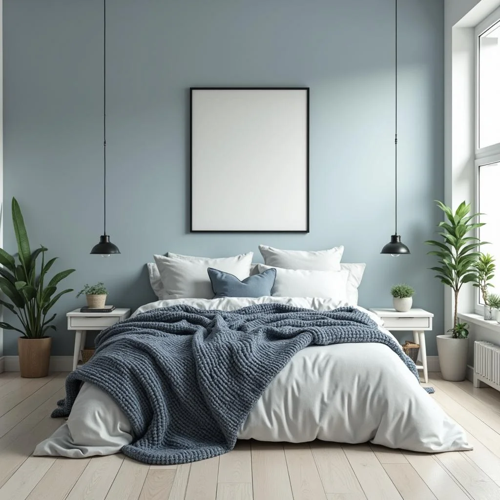 Clean lines and natural materials define this peaceful bedroom where dusky blue walls meet crisp white trim. The platform bed with built-in storage keeps your space organized while maintaining minimalist appeal. Large windows flood the room with natural light that enhances the calming blue hues throughout the day. Choose linen bedding in whites and soft grays to complement the Nordic aesthetic. A simple area rug defines the sleeping space while wooden floors add warmth. The reading chair by the window creates a cozy nook for quiet moments.