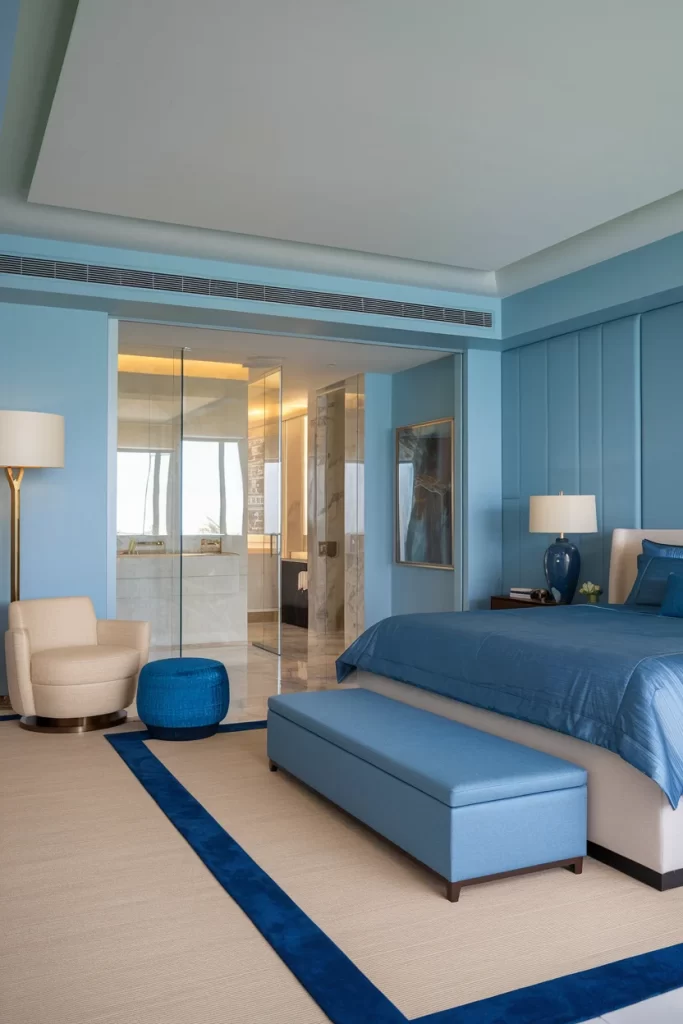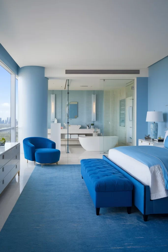 A modern master bedroom that extends into an open bathroom concept, using blue as the unifying color throughout. The soft blue walls create a calm, spa-like atmosphere, while blue accent furniture and textiles reinforce the theme. The clean white bathroom fixtures and contemporary lighting maintain the serene, uncluttered aesthetic perfect for relaxation.
