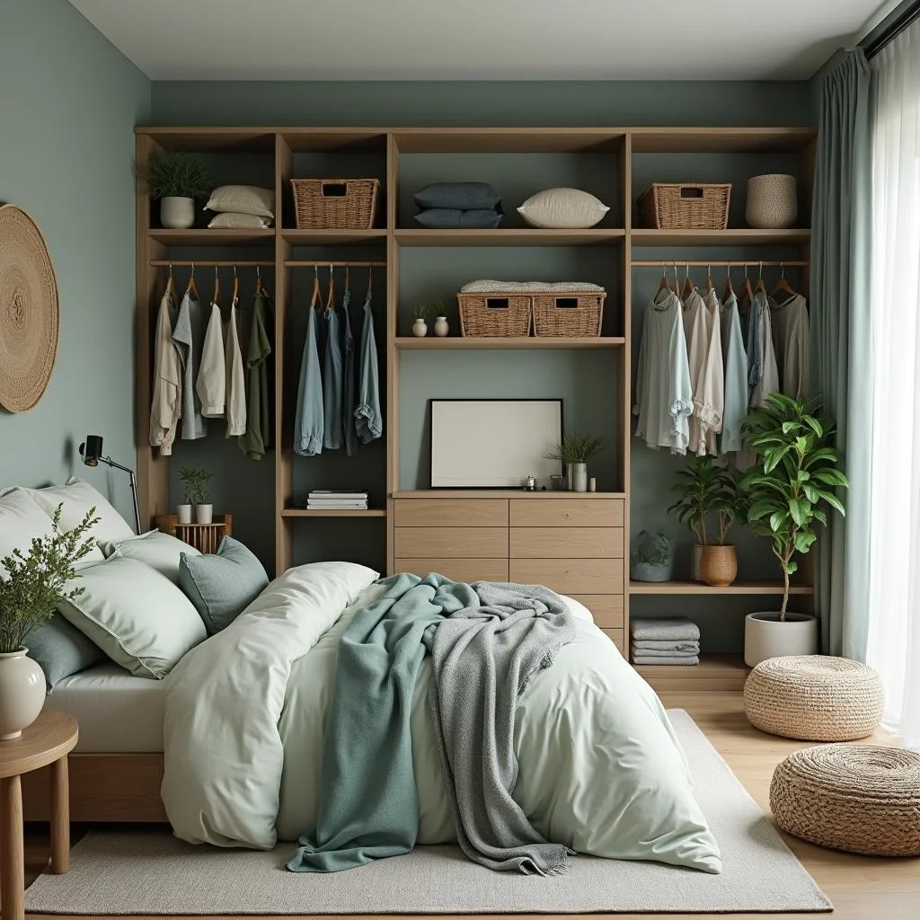 Wall-to-wall built-in storage creates an organized, luxurious dusky blue bedroom. Open shelving displays carefully curated items while closed cabinets hide everyday essentials. You can customize the storage to fit your specific needs and lifestyle. The organized approach reduces visual clutter and creates a calm environment. Natural textures through woven baskets and textiles add warmth to the space. A neutral color palette allows the blue walls to be the focal point. This solution works particularly well in bedrooms that need to serve multiple functions. The key is planning the storage carefully to maximize both functionality and visual appeal.