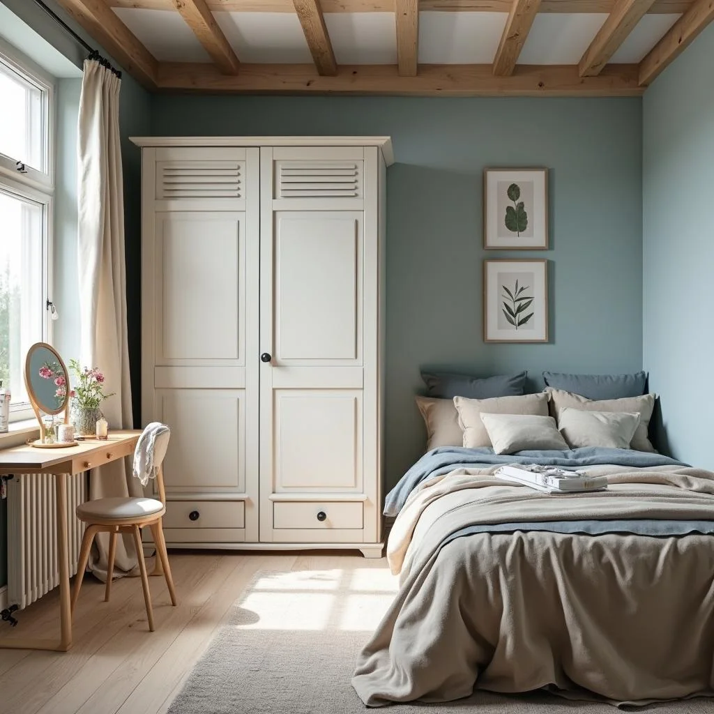 Light wood and natural textures create a Scandinavian-inspired dusky blue bedroom. Exposed ceiling beams add architectural character and warmth. You can achieve this look through natural materials like linen, wool, and unfinished wood. White painted furniture keeps the space feeling fresh and bright. The muted blue walls provide color without overwhelming the natural elements. Simple botanical prints connect the room to nature. This style emphasizes functionality and comfort over decoration. Storage solutions blend seamlessly with the overall design. The approach works well in bedrooms where you want to create a peaceful, uncluttered environment that promotes rest and relaxation.