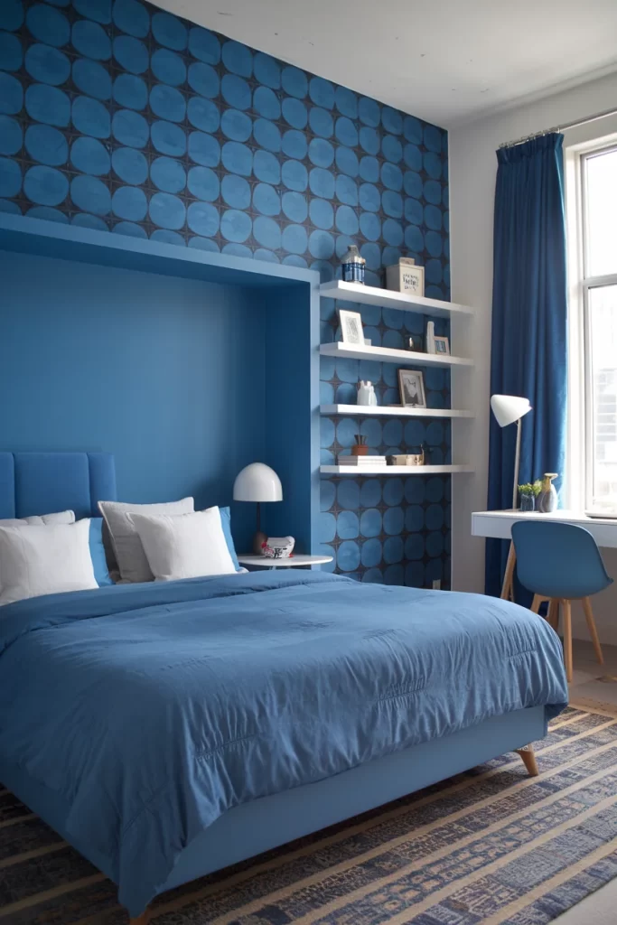 A modern approach to blue bedroom design featuring a bold geometric wallpaper in varying shades of blue as the focal point behind the bed. The built-in shelving and desk area maximize functionality while maintaining the clean, contemporary aesthetic. The blue bedding echoes the wall treatment, creating a cohesive look, while the neutral ceiling and white accents prevent the space from feeling overwhelming.