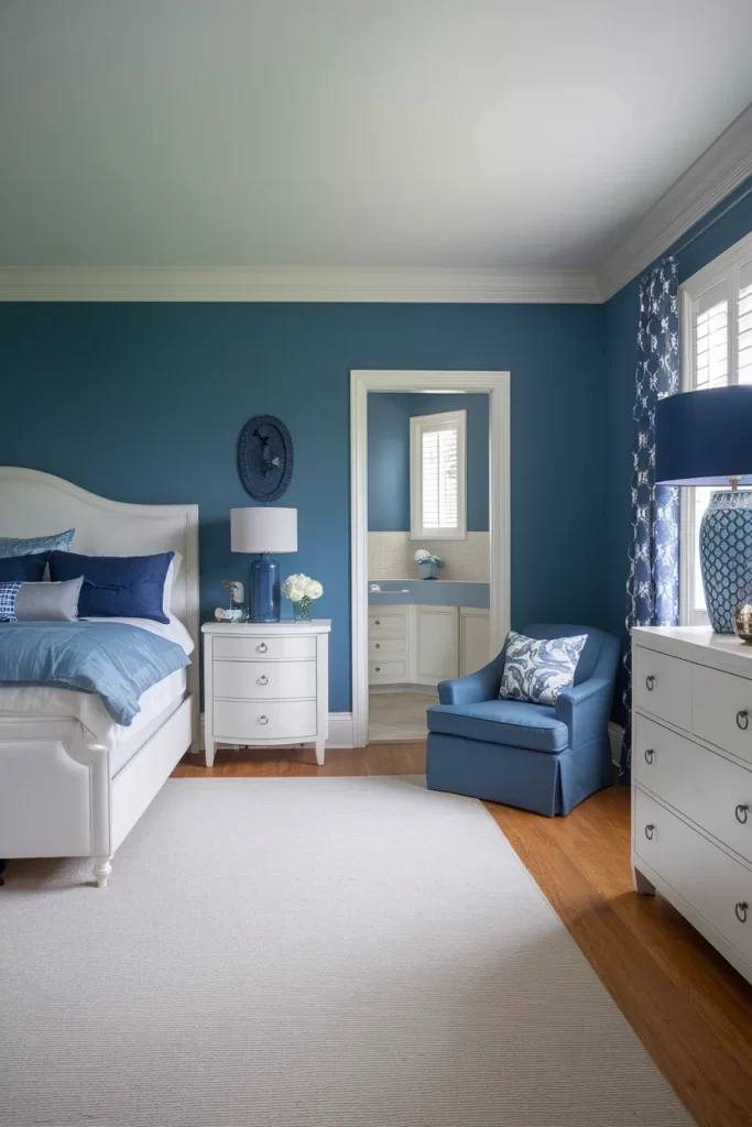 A traditional approach featuring medium-toned blue walls with crisp white trim and moldings. The white furniture, including the curved headboard and matching nightstands, creates beautiful contrast against the blue backdrop. Patterned curtains and a coordinating blue accent chair tie the color scheme together, while hardwood floors add warmth to the cool color palette.