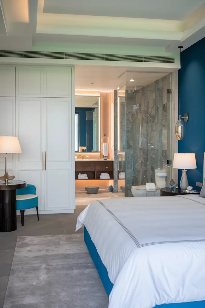 This sophisticated space combines deep blue accent walls with warm wood tones and contemporary furnishings. The open bathroom concept with glass partitions creates a luxurious hotel-suite feeling, while the blue and white color scheme remains consistent throughout. Modern lighting and sleek finishes elevate the overall design to a high-end aesthetic.
