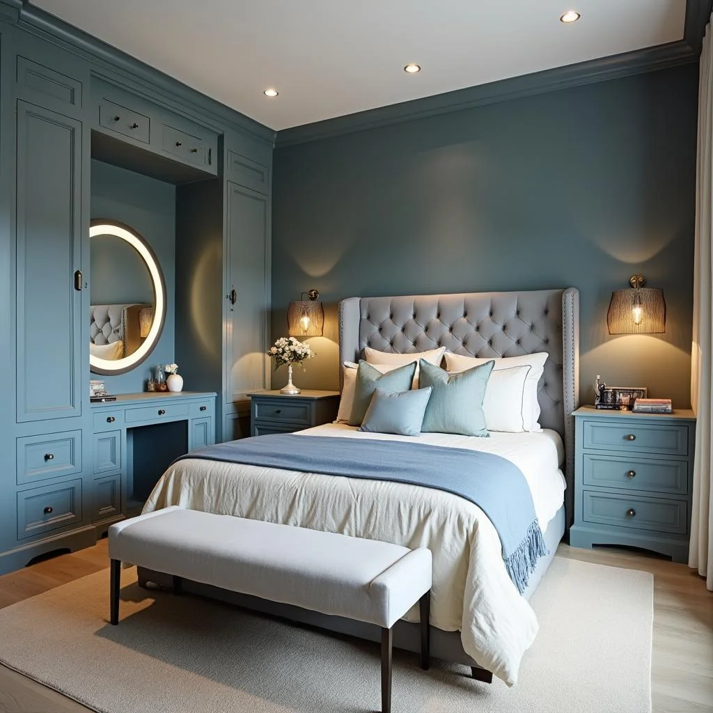 Built-in wardrobes and vanity areas create a traditional, elegant dusky blue bedroom. Symmetrical design elements provide balance and visual harmony. You can enhance the traditional feel through classic furniture shapes and decorative details. A tufted headboard adds luxury and comfort to the sleeping area. Warm lighting creates a cozy atmosphere for evening relaxation. The blue color palette feels timeless and sophisticated. This approach works well in larger bedrooms where you have space for multiple functional areas. Quality materials and attention to detail are essential for achieving the elegant look you want.