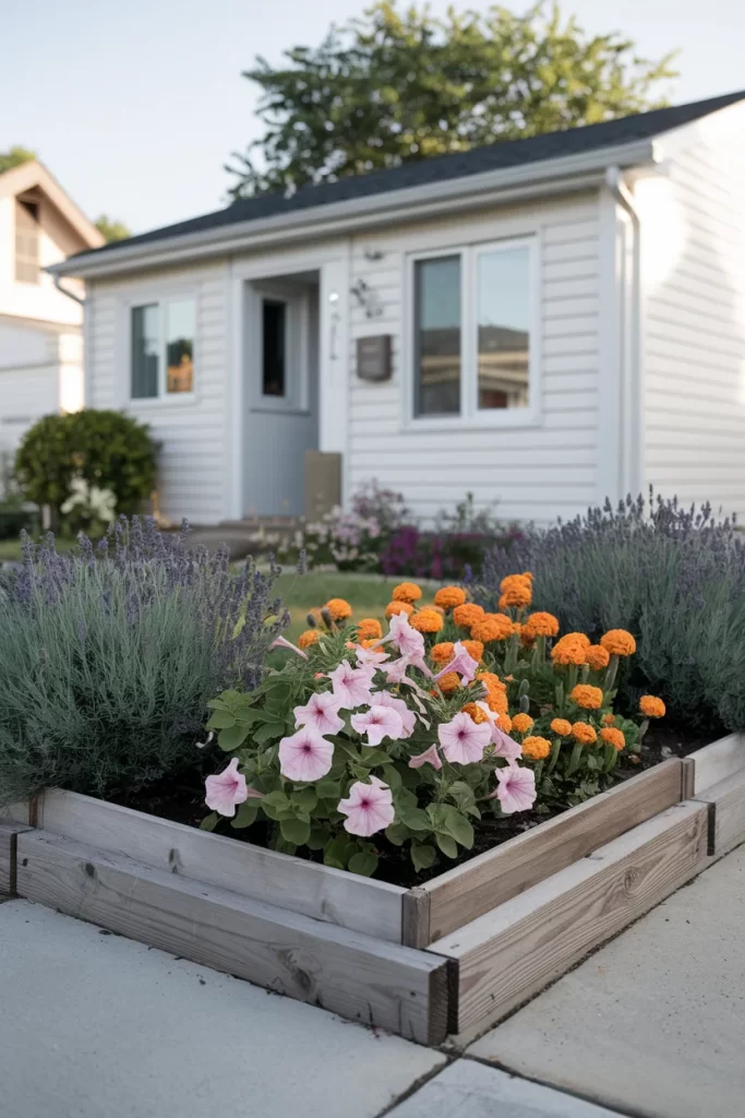 This weathered wood raised bed captures the relaxed charm of cottage garden style. The combination of purple petunias, orange marigolds, and silvery lavender creates a cheerful, informal display that complements the small white cottage. The natural wood construction and mixed plantings create an approachable, homey feeling that invites closer inspection.