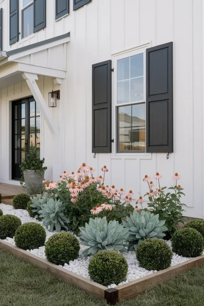 A classic white farmhouse-style home is enhanced by a structured foundation bed that combines form and function. The rectangular raised bed features white pebble mulch as a backdrop for blue-gray agave plants, pink coneflowers (Echinacea), and neatly trimmed boxwood spheres. This low-maintenance design proves that drought-tolerant plants can create stunning curb appeal while requiring minimal water.