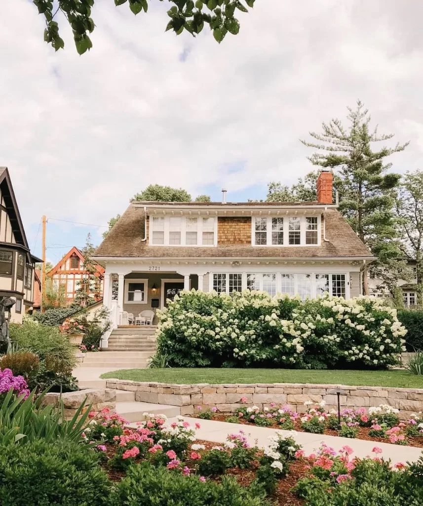 This picture-perfect craftsman-style home showcases a formal landscape featuring magnificent white hydrangeas forming a lush hedge across the front foundation. The terraced design incorporates natural stone retaining walls that frame colorful geranium beds in pink and coral tones. The symmetrical architecture with its distinctive dormer windows and covered porch is complemented by well-manicured lawn and thoughtful planting that balances structure with softness. This classic American landscape design creates wonderful curb appeal while maintaining a timeless aesthetic.