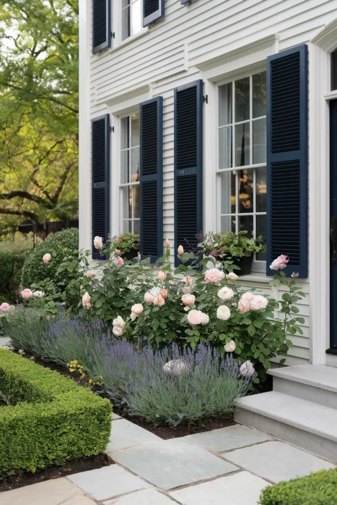 A pristine white colonial home with navy shutters provides the backdrop for this timeless foundation planting. Soft pink roses take center stage, complemented by silvery lavender that adds texture and fragrance. The formal symmetry is enhanced by neatly trimmed boxwood hedges that provide evergreen structure. Stone pavers create clean lines and practical access for maintenance. This design exemplifies how traditional plantings can enhance architectural features.