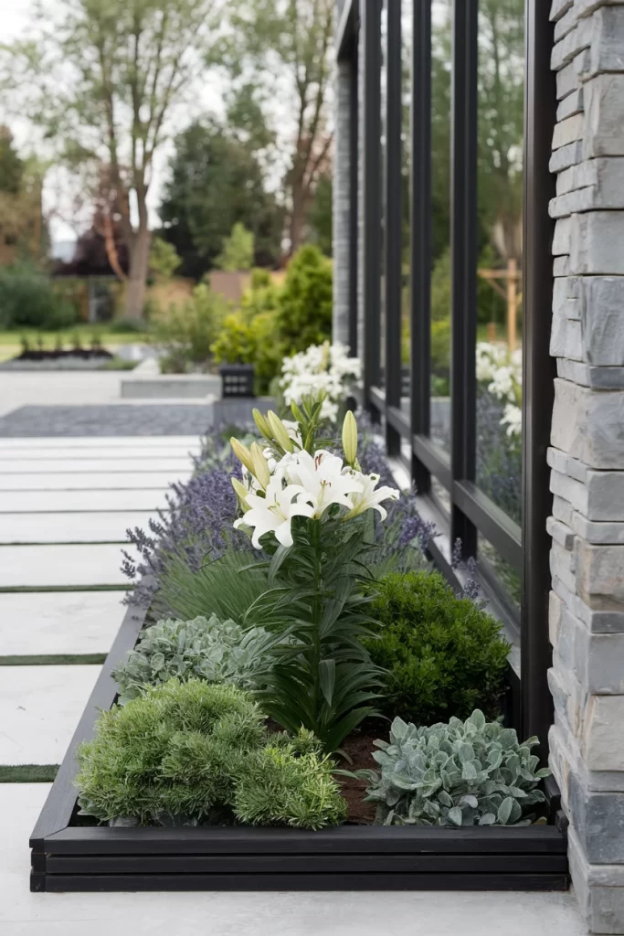 A sleek modern home with floor-to-ceiling windows provides the setting for this sophisticated foundation planting. White lilies serve as focal points among low-maintenance plantings including ornamental grasses, compact evergreens, and silver-leafed perennials. The black metal planter box creates clean lines that complement the home’s contemporary architecture. This design shows how minimal plant selections can create maximum impact.