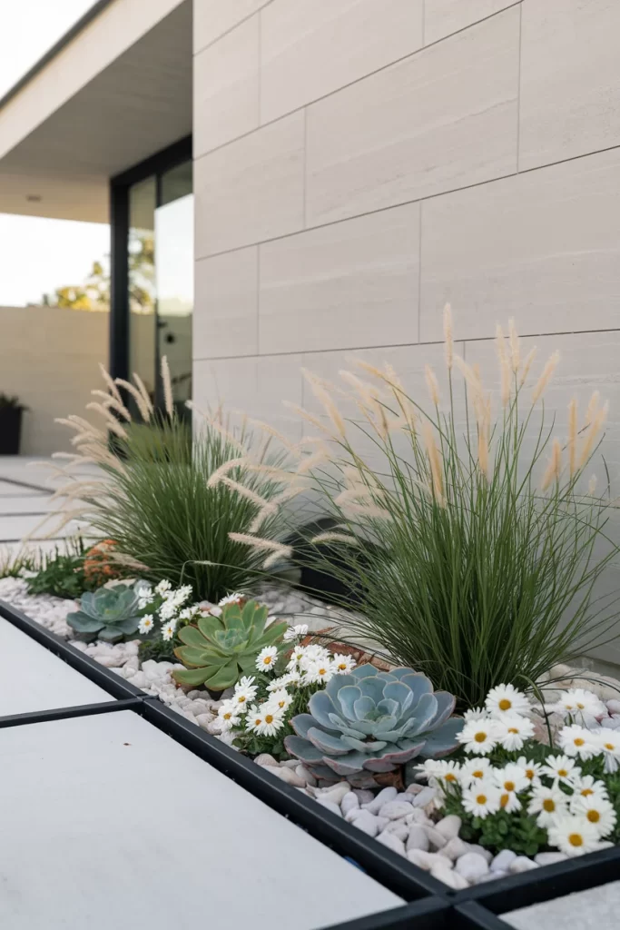 This modern home’s foundation planting strikes the perfect balance between architectural lines and natural softness. The black-framed planter bed contains ornamental grasses that echo the building’s clean geometry, while succulents and white flowering plants add organic curves. The white pebble mulch creates a clean, finished look that won’t fade or need frequent replacement.