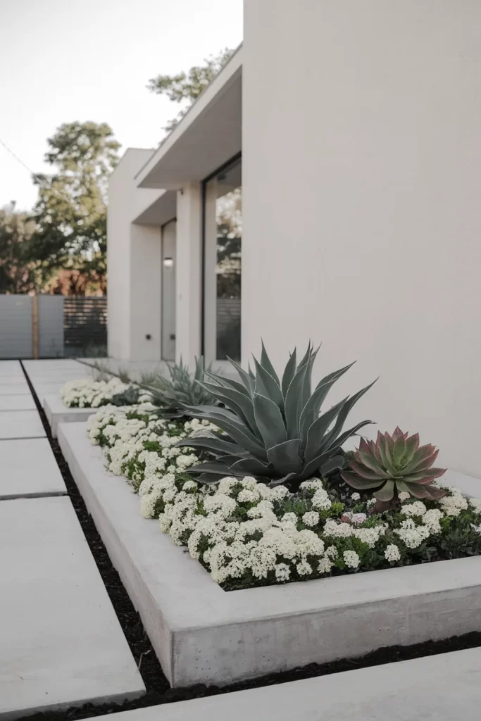 This ultra-modern home features a water-wise approach to foundation planting with architectural succulents as the stars. Large agaves create dramatic focal points while smaller succulents and white alyssum provide textural variety. The concrete raised planters echo the home’s clean geometric lines, and the minimal plant palette emphasizes form over color. This design shows how drought-tolerant plants can create striking contemporary landscapes.