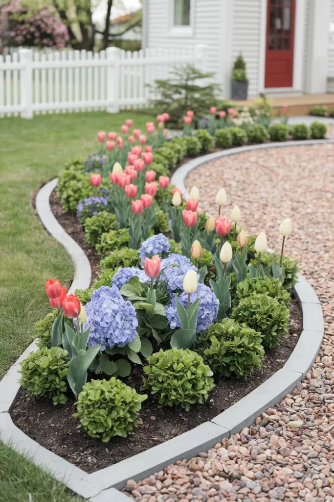 This sophisticated curved flower bed demonstrates how to soften hard architectural lines with flowing garden shapes. The white concrete edging creates crisp definition while the curved form adds movement to the landscape. Blue hydrangeas anchor the corners while pink and cream tulips dance throughout, creating a romantic spring display that transitions the home to the surrounding lawn.