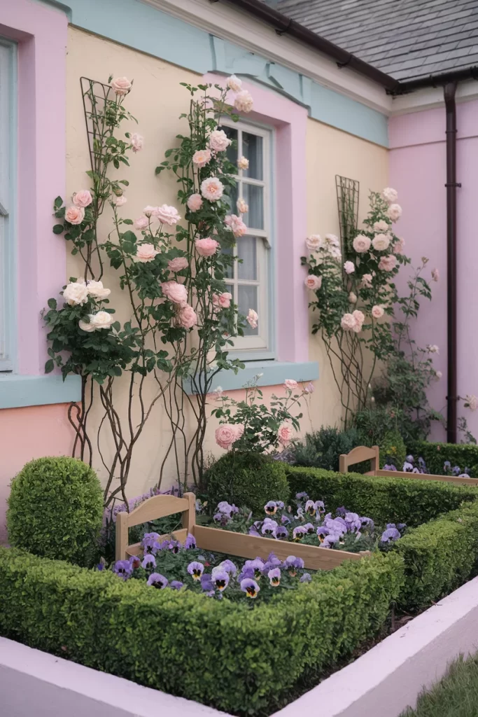 A picture-perfect cottage garden scene featuring soft pink climbing roses trained on dark metal trellises against pastel-colored house walls. The roses create a romantic backdrop while a formal boxwood hedge border frames purple pansies planted in geometric patterns. Small wooden plant markers add a practical yet decorative touch to this classic English garden design that combines structure with romantic flowering elements.