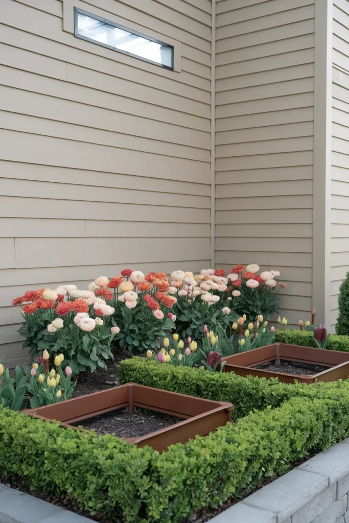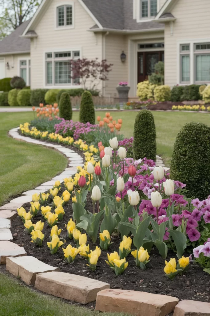 This neutral-toned home demonstrates the power of evergreen structure combined with seasonal color. Neatly trimmed boxwood hedges create permanent “rooms” within the bed, while spring tulips and chrysanthemums provide seasonal interest. The metal edging maintains clean lines, and the repeated geometric shapes create visual cohesion. This approach ensures the bed looks intentional year-round, even when seasonal flowers aren’t blooming.