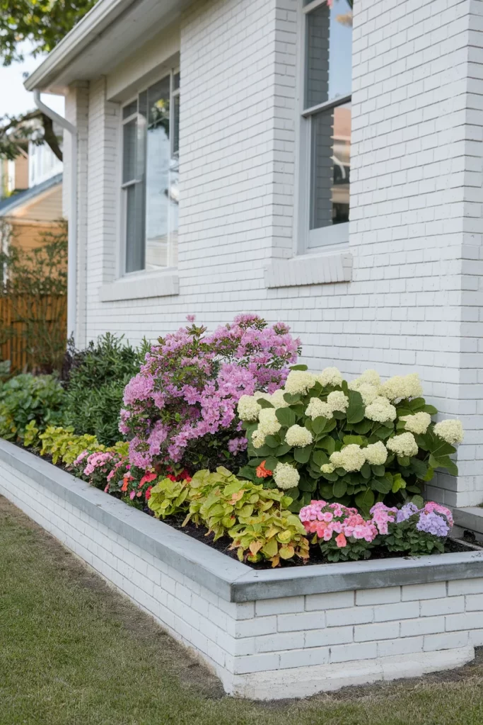 This elegant foundation planting combines pink azaleas and white hydrangeas for a classic look against a white brick home. The varying heights create natural layering, while colorful annuals like begonias and geraniums fill in at ground level. The raised brick border adds architectural interest and helps define the planting area, creating a polished look that enhances the home’s curb appeal.