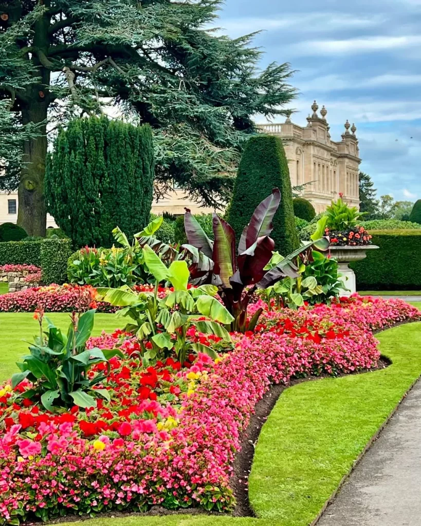 This formal estate garden demonstrates sophisticated bedding design with bold tropical elements. Dark-leaved cannas serve as dramatic focal points rising from masses of red and pink begonias, creating striking color combinations against the pristine lawn. Sculptural topiary and mature cedars frame views of the classical architecture beyond, while ornamental urns add traditional elegance. The curved bed design and expert plant selection showcase how tropical plants can be incorporated into formal European-style gardens for visual impact.