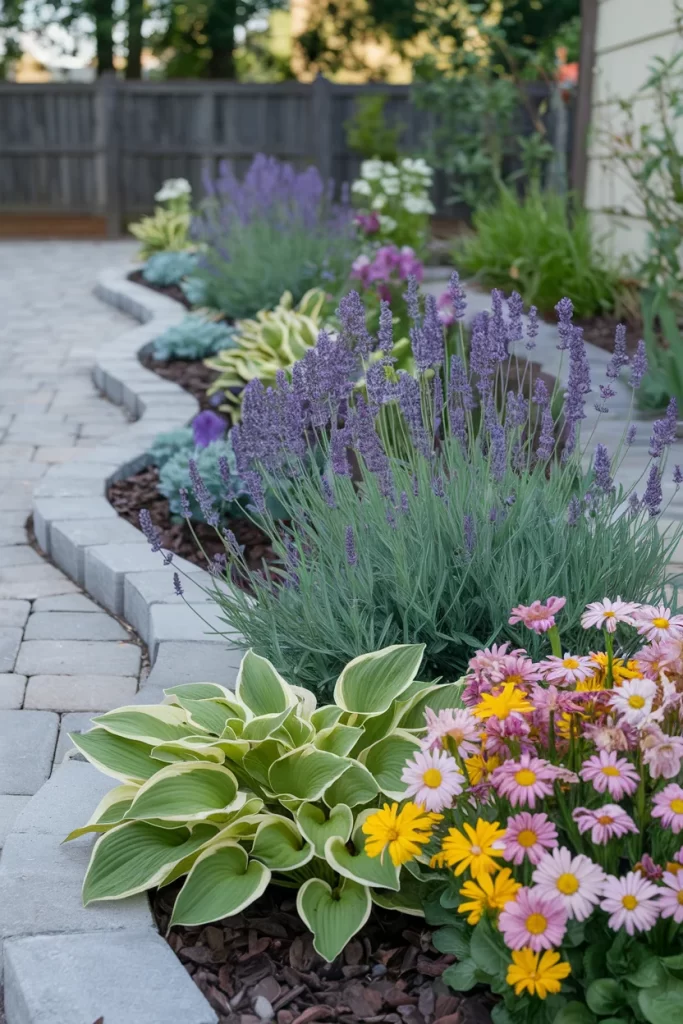 A sophisticated landscape design featuring purple lavender as the star plant, complemented by variegated hostas and colorful daisy-like flowers in pink and yellow. The curved stone edging creates clean lines while allowing plants to flow naturally. This low-maintenance design is perfect for sunny locations and demonstrates how to combine perennials with different textures and bloom times for season-long interest.