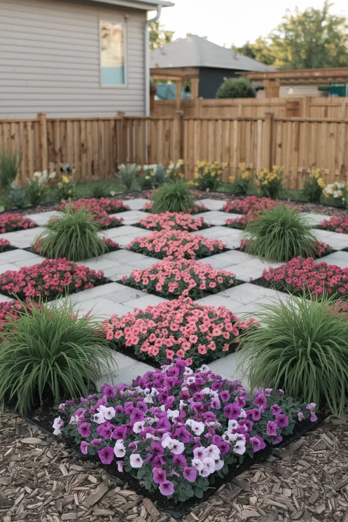 This contemporary backyard design features a striking geometric approach to flower bed layout. Square concrete pavers alternate with diamond-shaped planting areas filled with pink petunias and ornamental grasses. The repetitive pattern creates visual rhythm while the wooden fence provides privacy and backdrop. This design demonstrates how modern hardscaping can create structured growing spaces that require less maintenance than traditional beds.