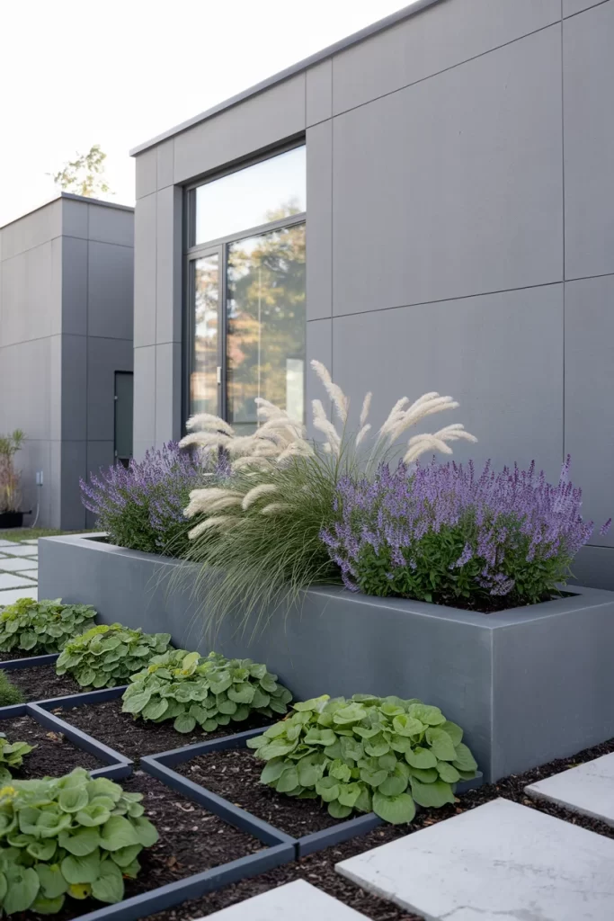 This contemporary front yard features a sleek gray concrete planter box that complements the home’s modern architecture. The raised bed showcases purple lavender and ornamental grasses with their feathery plumes, creating textural contrast against the smooth gray siding. Below the elevated planter, large-leafed hostas are planted in geometric ground-level beds, demonstrating how to layer plantings at different heights for visual depth.