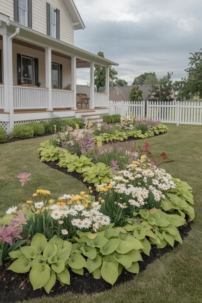 A classic American home benefits from this generous perennial border that provides three-season interest. Large hostas create a foundation of green foliage, while white daisies and purple flowering perennials add pops of color. The varied heights and textures create a lush, established look that enhances the home’s traditional architecture without overwhelming it.