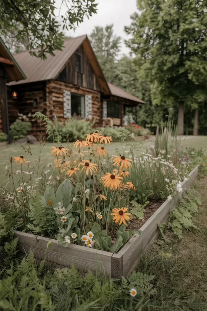 Set against a charming log cabin backdrop, this wooden raised bed captures the essence of cottage garden style. Orange rudbeckia (black-eyed Susan) dominates the planting, accompanied by white daisies and mixed perennials that create a naturalistic, wildflower meadow effect. The rustic wood construction harmonizes perfectly with the cabin’s natural materials.