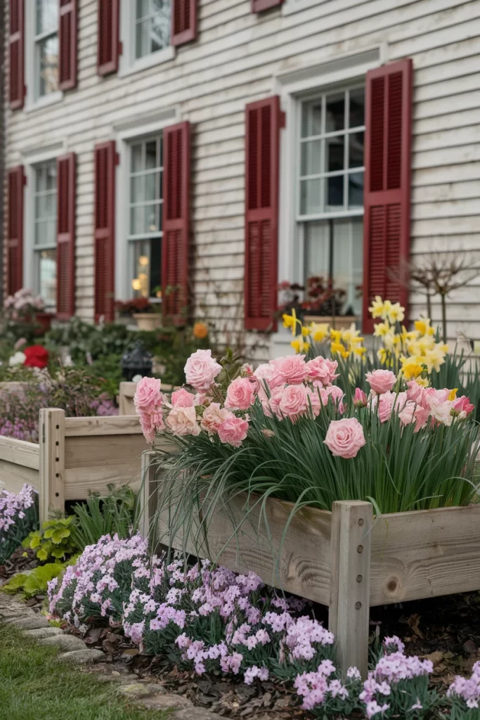 This wooden raised bed garden showcases the perfect spring combination of pink ranunculus flowers paired with bright yellow daffodils. The natural wood construction complements the traditional home’s red shutters, while purple creeping phlox spills over the edges as ground cover. This design demonstrates how bulb gardens can provide early season color and how raised beds add dimension to flat foundation plantings.