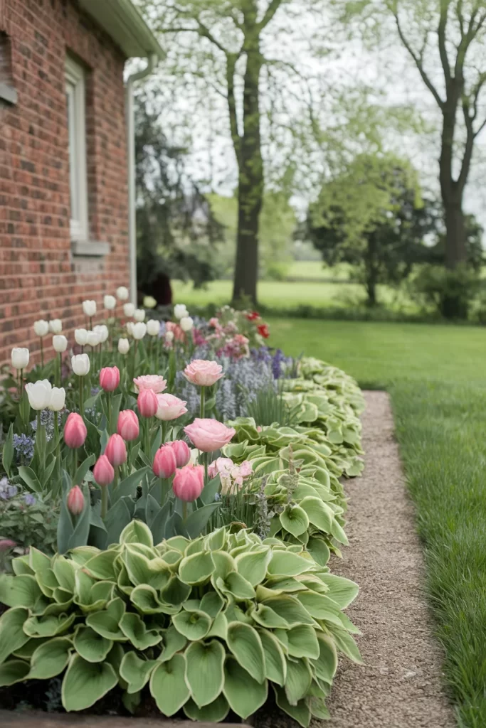 This elegant brick home features a sophisticated foundation planting that combines spring bulbs with established perennials. Pink and white tulips create vertical interest among the low-growing lavender and large-leafed hostas that provide year-round structure. The natural mulched pathway adds an organic element while the varied plant heights create visual depth. This design shows how mixing bulbs with perennials ensures interest across multiple seasons.