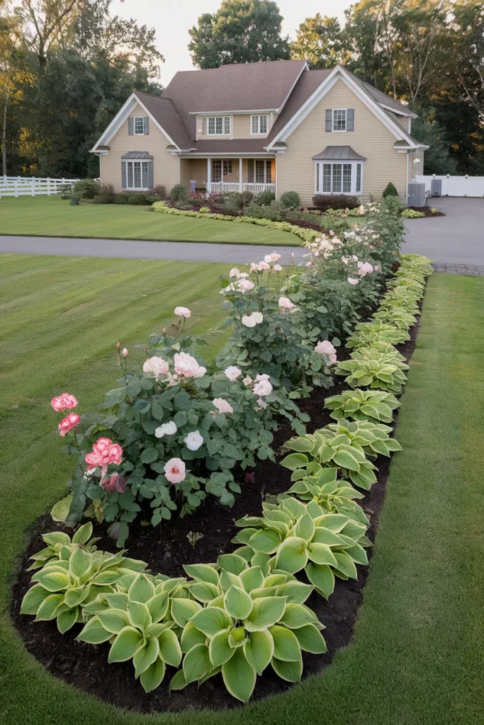 This traditional home features a graceful curved flower border that softens the transition between hardscaping and lawn. Pale pink roses anchor the planting while variegated hostas provide textural contrast and help fill space between rose bushes. The flowing line of the bed creates movement and guides the eye along the property. This design illustrates how curved beds can feel more natural and welcoming than straight-edged alternatives.
