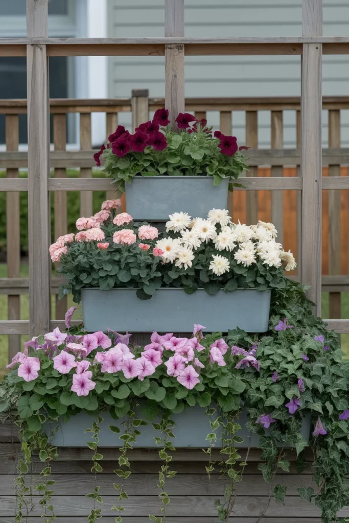 This charming setup features three stacked gray planters creating a vertical garden against a wooden fence. The top planter showcases deep burgundy petunias, the middle tier displays a mix of coral-pink mums and white daisies, while the bottom planter overflows with light pink petunias and trailing greenery. This tiered approach maximizes planting space in small areas while creating visual interest through varying heights and complementary color schemes.