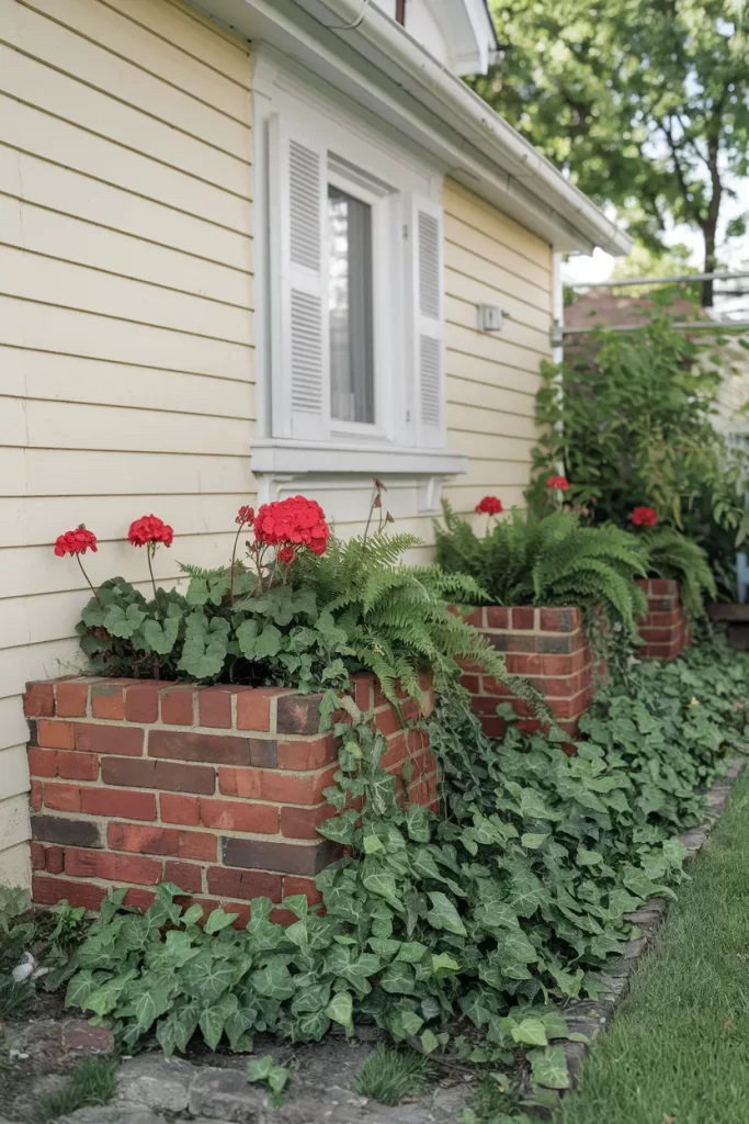 A classic colonial home features traditional foundation planting elevated with seasonal additions. Red geraniums in the brick planter boxes provide vibrant color, while ferns and mixed perennials create a lush understory planting. This approach shows how to maintain timeless appeal while incorporating fresh seasonal elements.