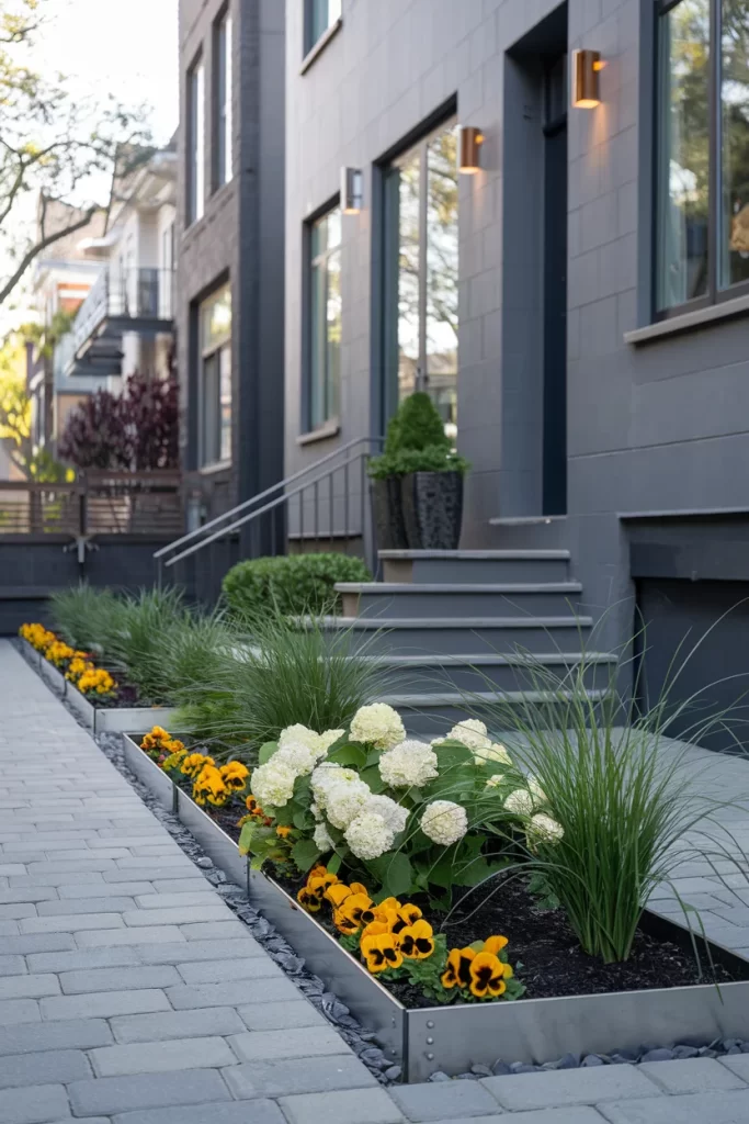 This narrow planting bed maximizes impact in a small space, perfect for urban front yards. The steel edging creates modern lines that complement the gray contemporary architecture, while white hydrangeas provide substantial blooms. Orange pansies and ornamental grasses fill in the composition, proving that even narrow strips can pack significant visual punch.