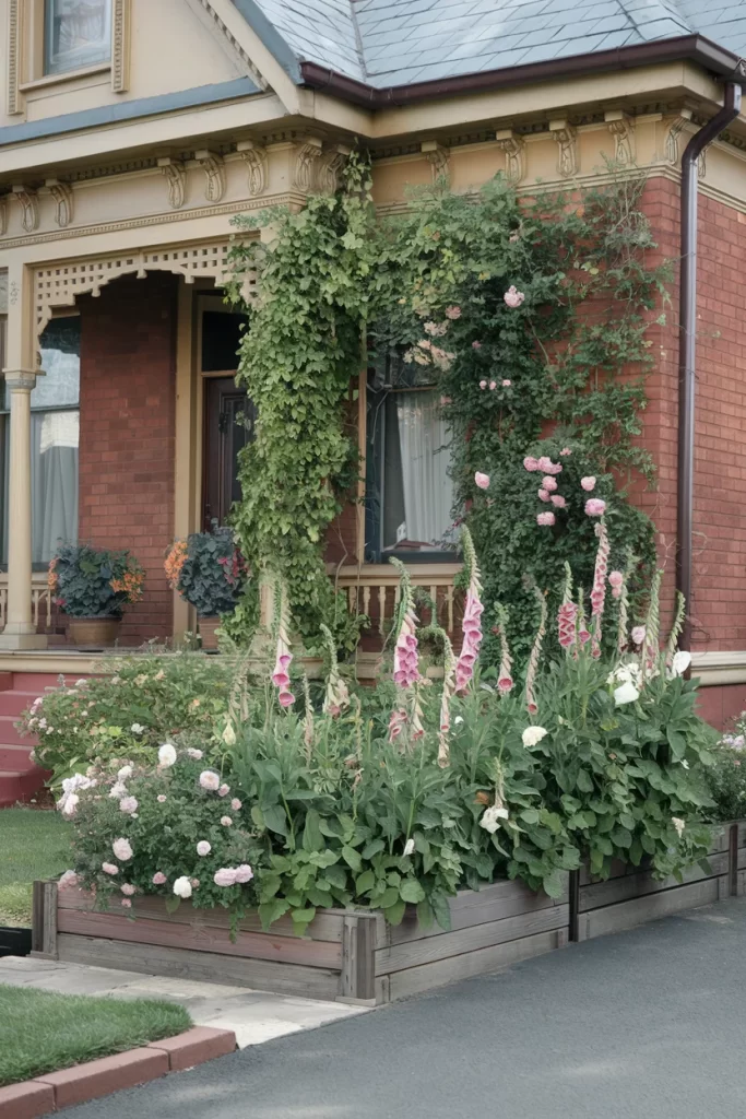 This beautifully restored Victorian home showcases a romantic cottage garden approach with climbing roses adorning the ornate porch columns. Pink foxgloves create dramatic vertical spikes among lower perennials, while the varied plant heights and informal arrangement capture the essence of English garden design. The raised wooden planter box helps define the space while providing better drainage. This style proves how period-appropriate plantings can enhance historic architecture.
