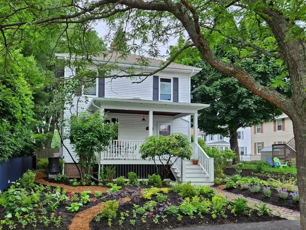 This refreshed front yard exemplifies modern shade gardening with its diverse collection of hostas, ferns, and foliage plants creating a lush, low-maintenance landscape. The design works harmoniously with existing mature trees, using varied leaf textures and colors from chartreuse to deep burgundy. Mulched pathways wind through the plantings, leading to the welcoming front porch of this classic two-story home. This approach proves that beautiful gardens don’t require full sun—strategic plant selection can create depth and interest in challenging conditions.