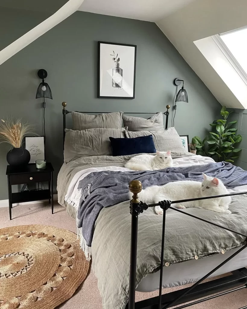 This sloped-ceiling bedroom uses green to create a cozy retreat feeling. The metal bed frame and neutral linens are classic choices, while the green wall anchors the space despite the challenging architecture. Two white cats add a homey touch to this intimate space.