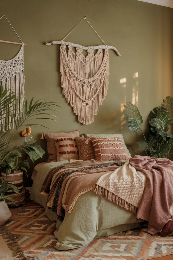A cozy bohemian bedroom painted in warm sage green walls features natural textures throughout. Large macramé wall hangings serve as artistic focal points, while layered textiles in earthy tones create depth and warmth. Abundant plants and woven baskets enhance the organic, free-spirited aesthetic that’s perfect for a relaxed, artistic lifestyle.