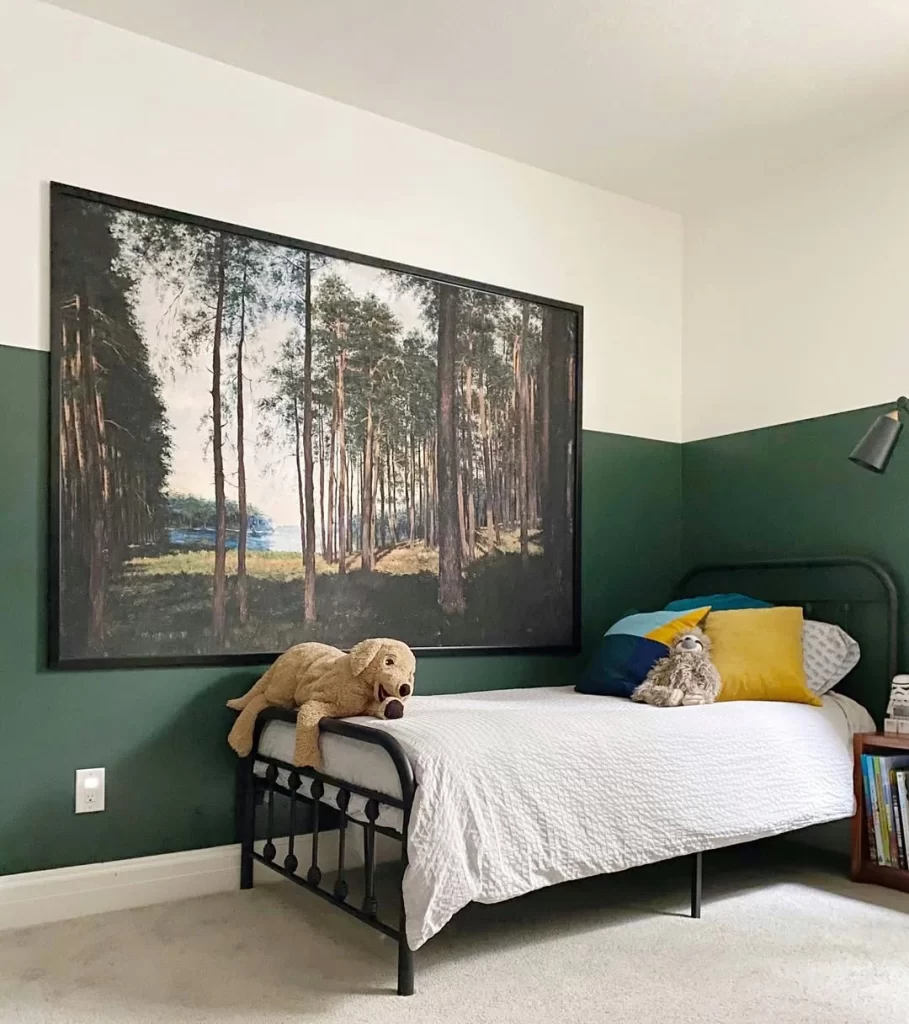This children’s bedroom uses green as a bold backdrop for the large forest landscape artwork, creating an adventurous outdoor theme. The two-tone wall treatment with green on the bottom and white on top helps balance the dramatic artwork. The simple black metal bed and minimal decor let the striking forest scene take center stage.