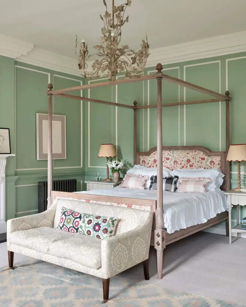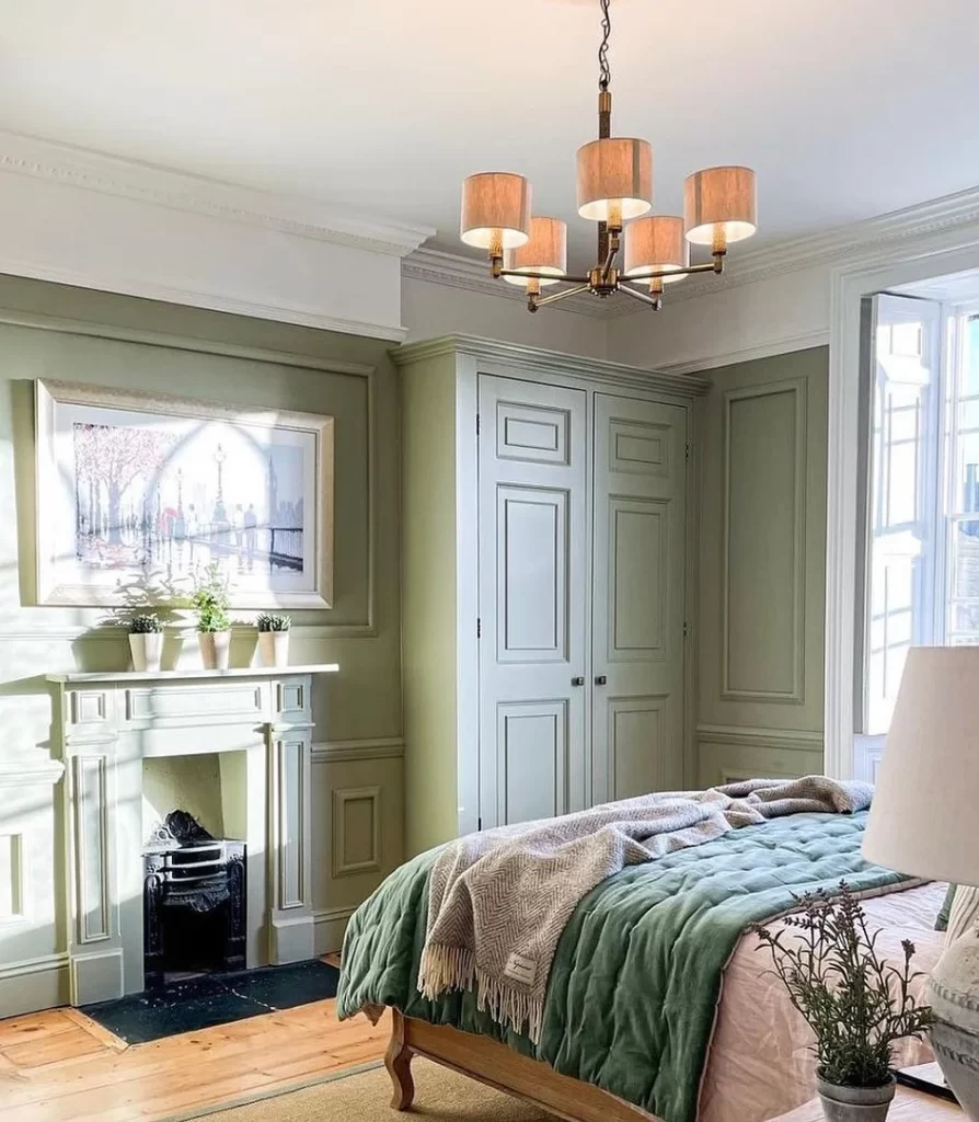 This bedroom demonstrates how sage green walls can create a timeless, sophisticated space. The room features beautiful paneled walls painted in a soft green hue, complemented by a traditional fireplace and built-in wardrobes. The layered bedding in coordinating green tones, along with the brass chandelier and hardwood floors, creates a luxurious yet cozy retreat.