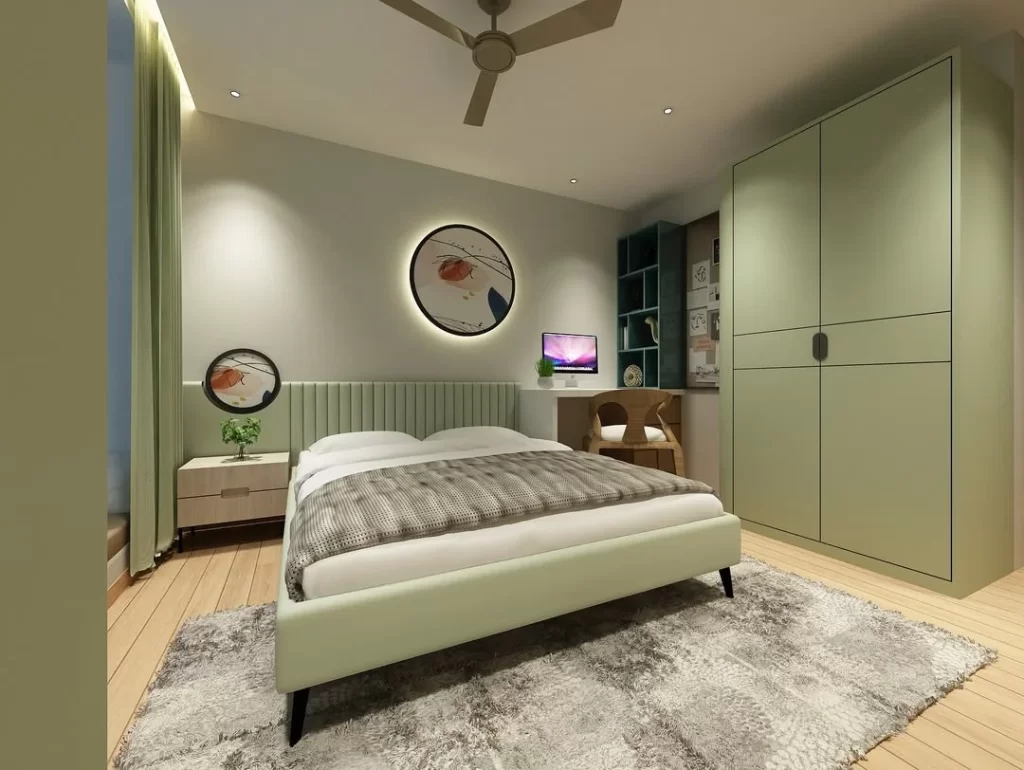 This modern bedroom design features a sophisticated sage green color palette with sleek built-in wardrobes that blend seamlessly into the walls. A platform bed with an upholstered headboard creates clean lines, while recessed lighting and a ceiling fan provide functional illumination and air circulation. The wooden floors and geometric area rug add texture and warmth to the minimalist design.