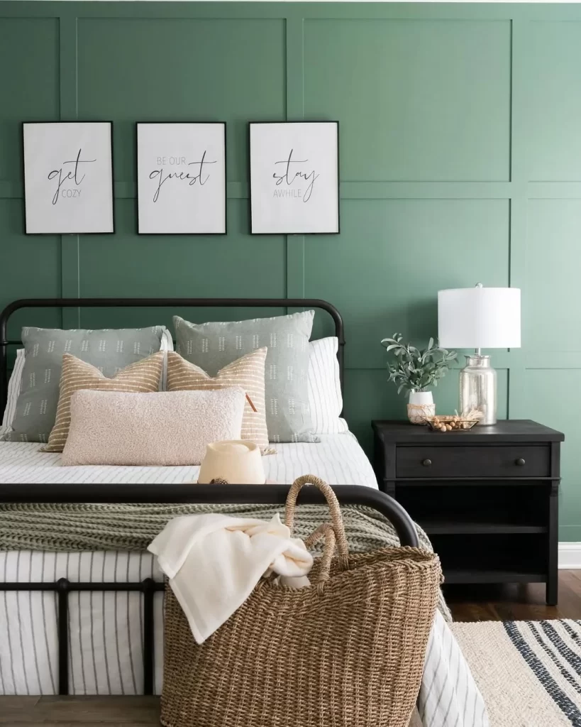 This modern bedroom uses a fresh sage green for both the accent wall and paneling, creating visual depth and interest. The black metal bed frame provides a striking contrast, while the neutral bedding and natural textures (like the wicker basket) keep the space balanced. The trio of minimalist prints adds a contemporary touch without overwhelming the serene color palette.