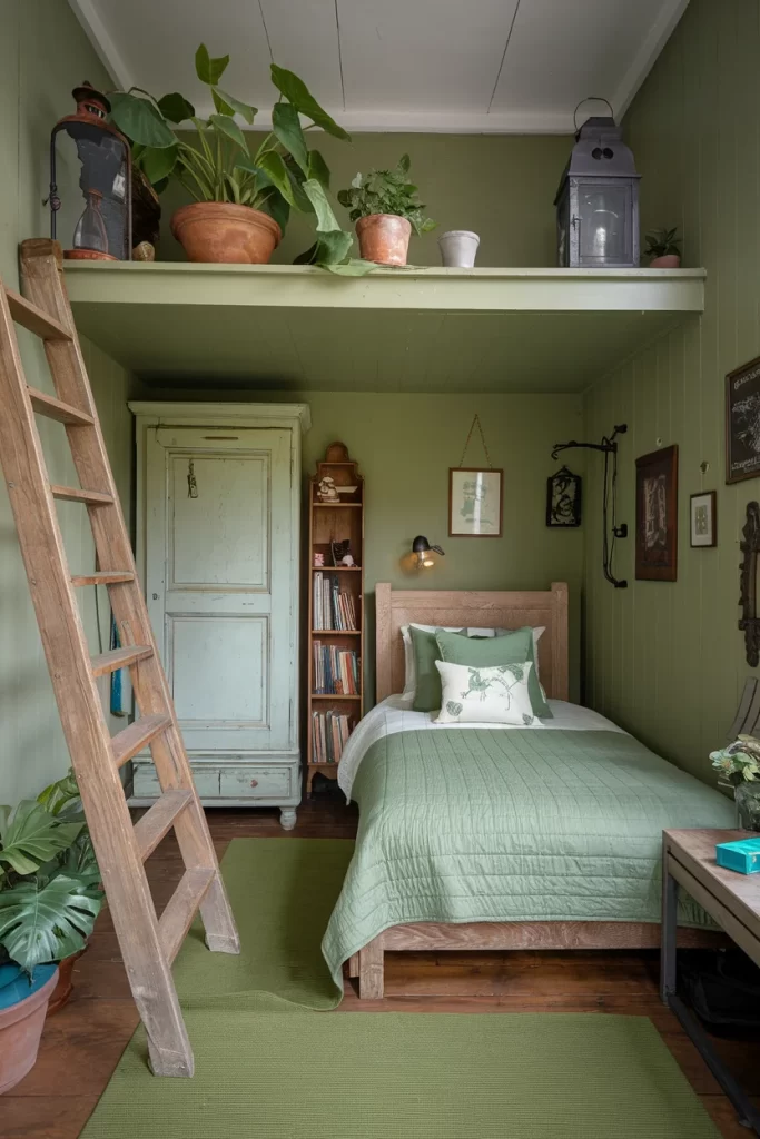 This charming bedroom features sage green walls with vertical wood paneling and a clever loft storage area accessed by a rustic wooden ladder. The space maximizes vertical storage with plants and lanterns displayed on the upper shelf. A cozy single bed with green quilted bedding sits below, complemented by a vintage pale green armoire and wooden bookshelf. The room’s cottage aesthetic is enhanced by botanical prints and abundant greenery.