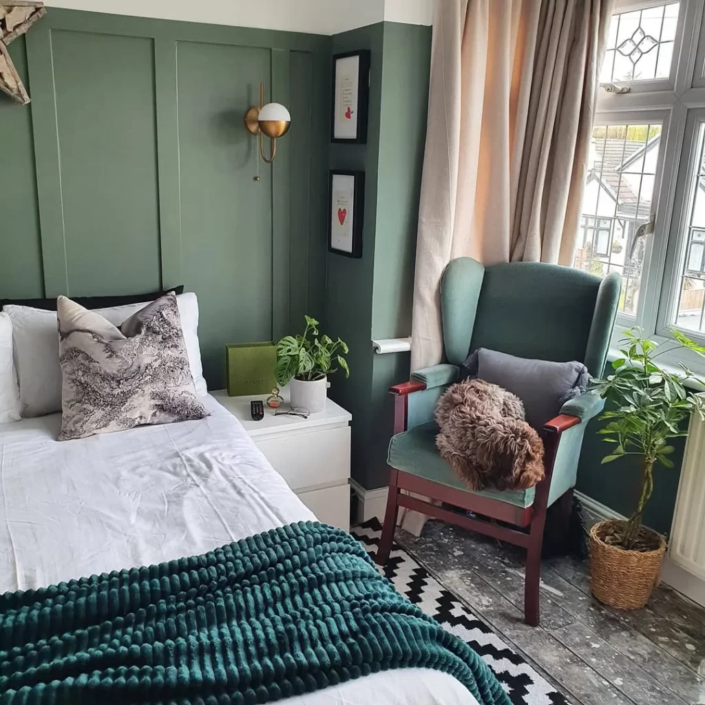 A smaller bedroom space uses green paneling to create intimacy. The vintage-style wingback chair in coordinating green creates a reading corner, while the white bed and linens keep the space from feeling cramped. Small decorative elements and plants add personality without overwhelming the compact space.