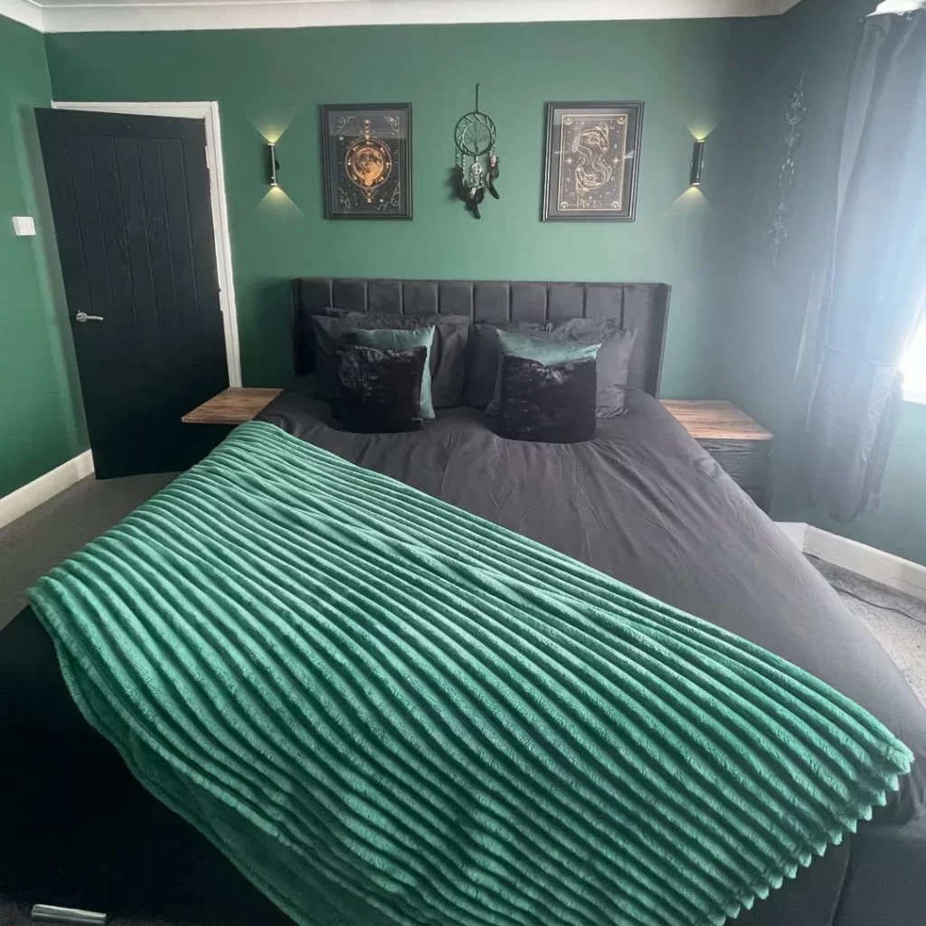 This bedroom embraces a deeper forest green with decorative wall art including what appears to be celestial and mystical-themed pieces. The dark headboard and bedding create a moody, cocoon-like atmosphere. The green ribbed throw adds texture while maintaining the monochromatic color scheme.