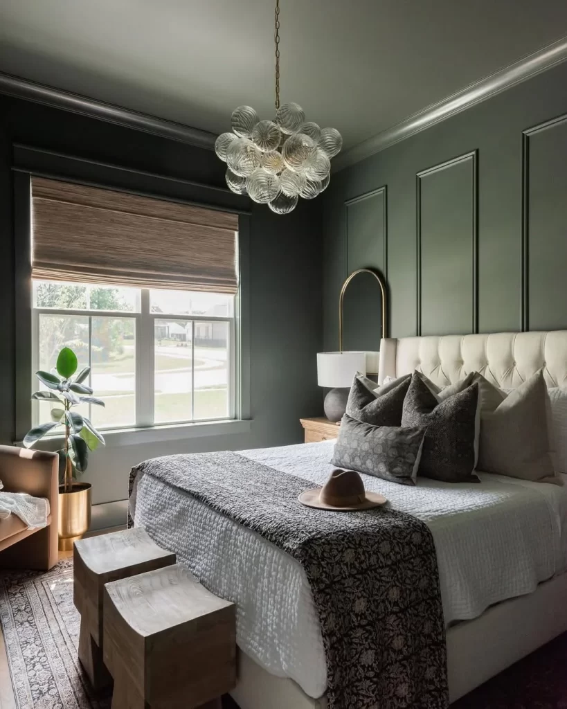 This bedroom embraces a more dramatic approach with deep emerald green walls and ceiling. The tufted cream headboard adds luxury and softness, while the textured bedding in grays creates visual interest. The glass bubble chandelier serves as a stunning focal point, and the layered textures throughout make this dark green space feel rich and inviting rather than heavy.