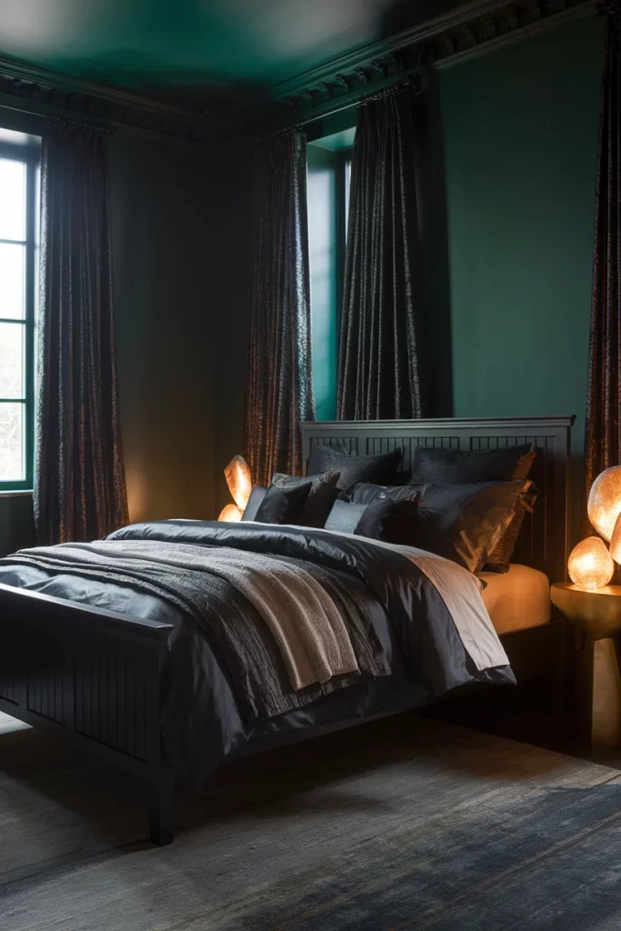 A moody, dramatic bedroom features deep forest green walls with rich textures and warm lighting. Dark bedding and metallic accents create a cocoon-like atmosphere, while floor lamps provide ambient lighting. The heavy curtains and saturated color palette make this space feel intimate and enveloping.