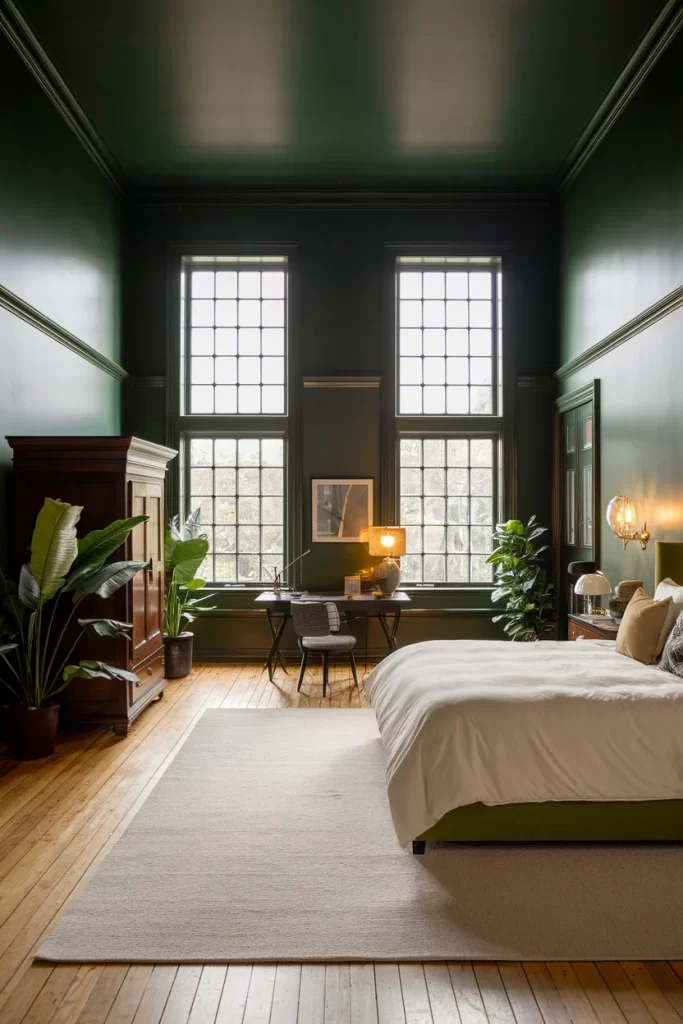 A striking design featuring deep forest green on the lower walls and ceiling, with lighter green above. This high-contrast approach creates visual drama while the tall windows flood the space with natural light. The neutral bedding and wooden desk area balance the bold wall treatment, and large plants add life to the sophisticated color scheme.
