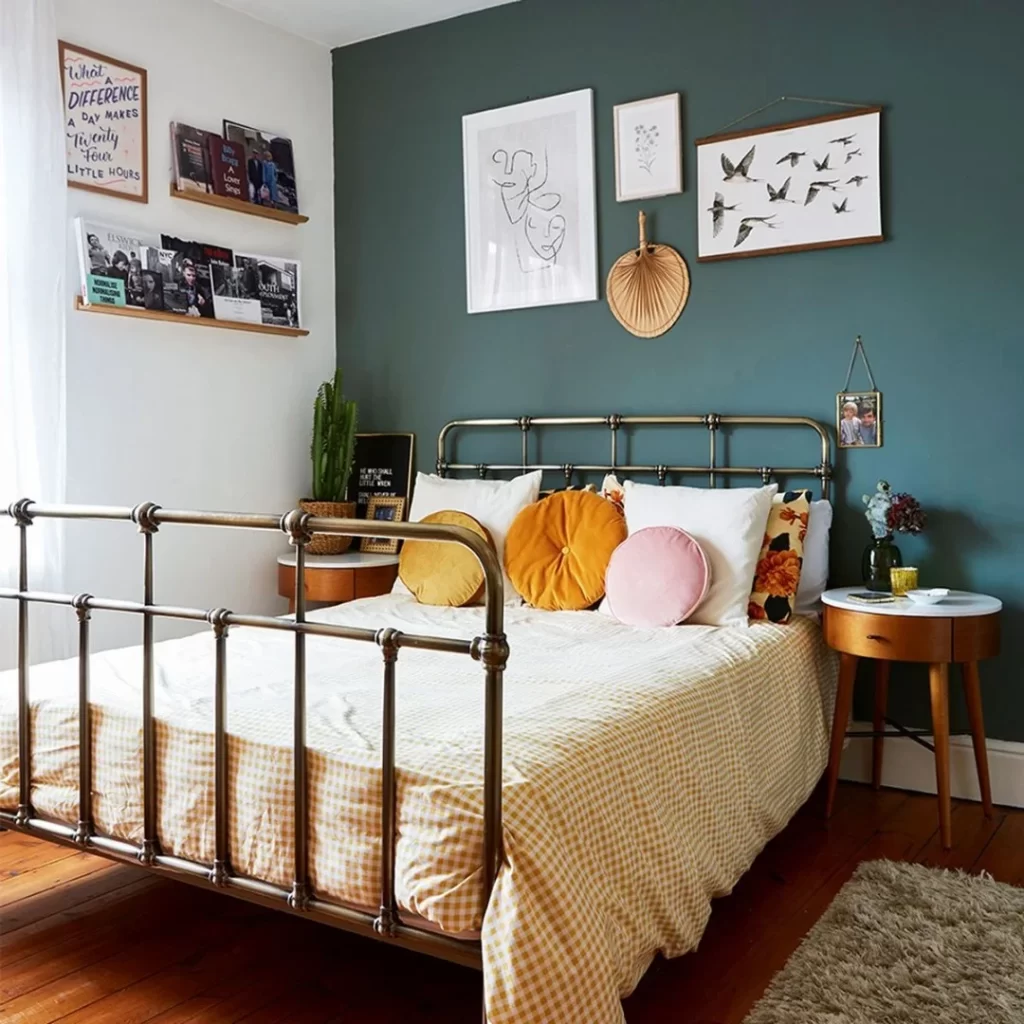 A vibrant green accent wall paired with a brass daybed frame creates an eclectic, bohemian feel. The room incorporates multiple textures through gingham bedding, round velvet pillows in various colors, and natural wood elements. The mix of patterns and warm metallics prevents the green from feeling cold.