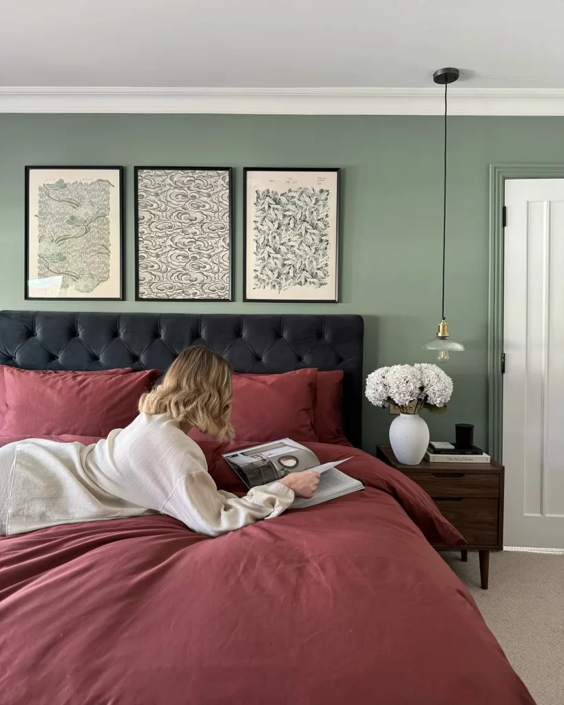 This refined bedroom features soft sage green walls that create a serene backdrop for rich burgundy bedding. A black tufted headboard adds luxury and texture, while three framed botanical prints create an elegant gallery wall above the bed. The room includes mid-century modern furniture pieces, including a wooden nightstand, and a pendant light with brass accents. This sophisticated color combination demonstrates how green can anchor more dramatic accent colors.