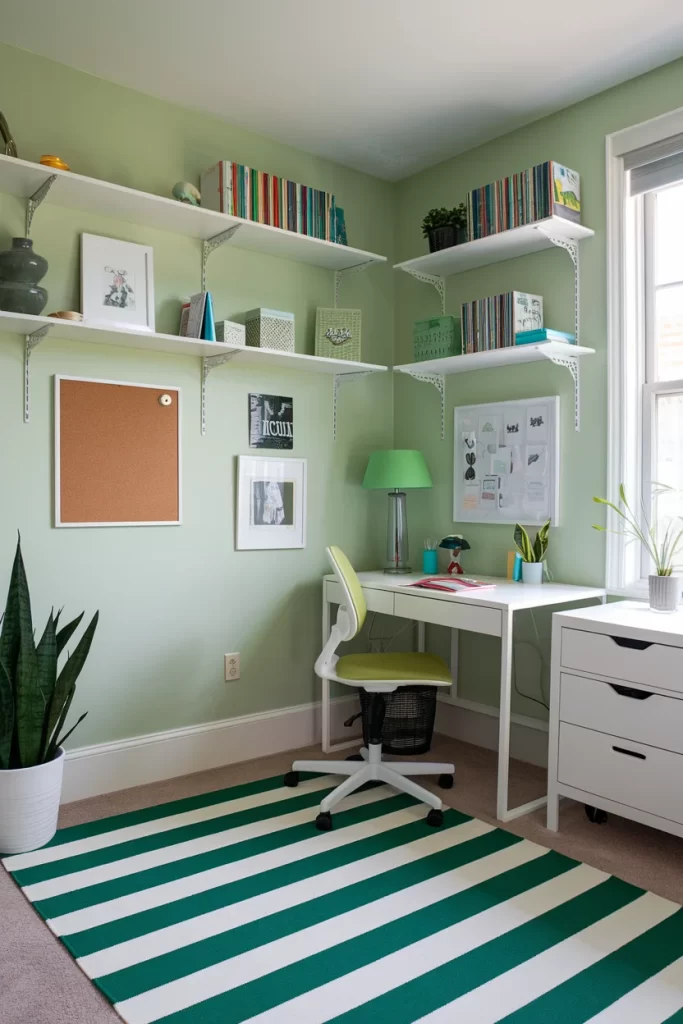 This bright workspace showcases light green walls with white floating shelves creating an organized study area. The corner desk setup maximizes space efficiency, while the green and white striped rug adds pattern and ties into the wall color. This design proves that green works beautifully in functional spaces, creating an energizing yet calm environment for productivity.