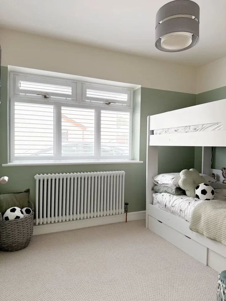 This kids’ bedroom demonstrates how green can work beautifully in shared spaces. The soft sage green walls create a calming environment, while the white bunk bed keeps the space feeling open and bright. The soccer theme is subtly incorporated through accessories, and the traditional radiator and window treatments add classic architectural interest to this functional family bedroom.