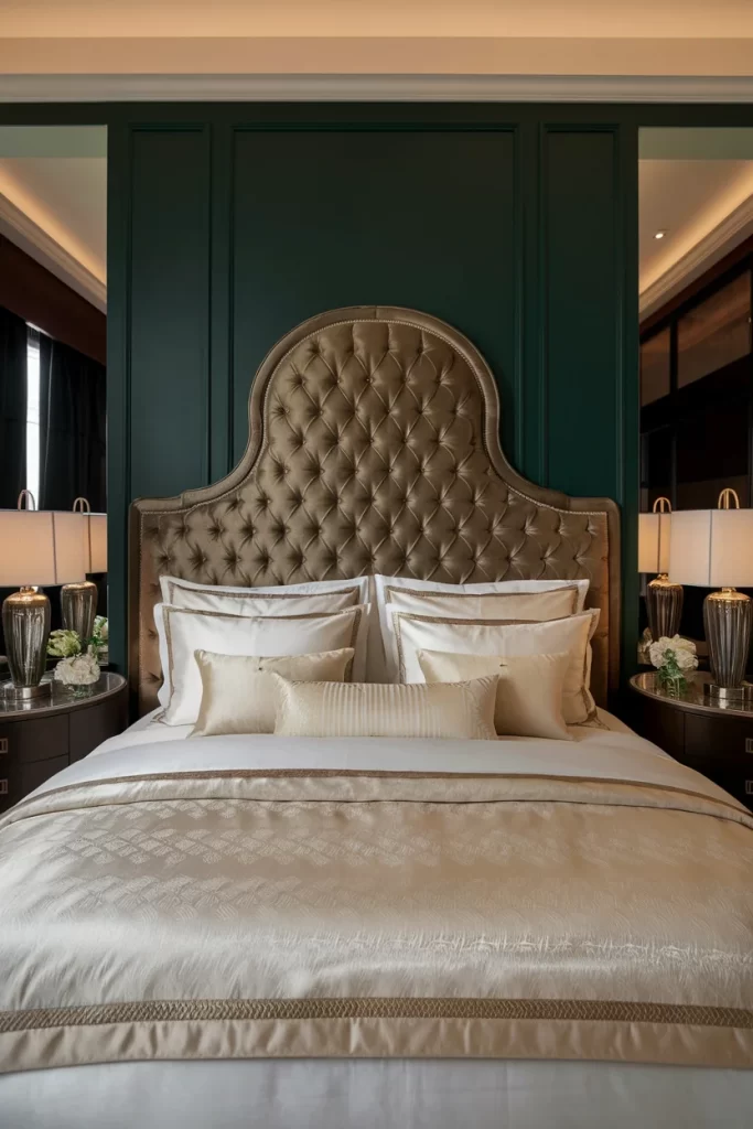 This sophisticated bedroom showcases deep emerald green paneled walls that create a rich, dramatic backdrop. The centerpiece is an ornate tufted headboard in neutral tones with decorative nailhead trim. Crystal table lamps and carefully layered bedding in creams and golds add luxury, while the formal paneling gives the space a refined, hotel-like atmosphere.